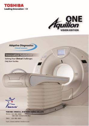 도시바 Aquilion ONE ViSION Edition(애퀼리언 원 비젼)은 2013년 RSNA(북미방사선학회)에 처음소개된 장비로 Wide Area-Detector를 이용하여 1 Rotation(한 번 회전)에 160mm의 범위를 0.275초만에 검사할 수 있는 도시바의 최신 CT 장비입니다.