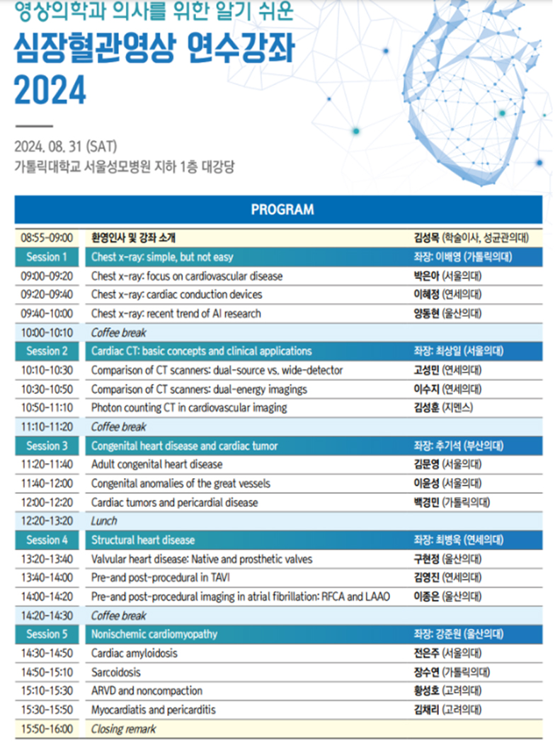 2024년 8월 31일 토요일 서울 성모병원 본관 지하 대강당에서 ‘영상의학과 의사를 위한 알기 쉬운 심장혈관 영상 연수강좌 2024’ 가 열렸었습니다.